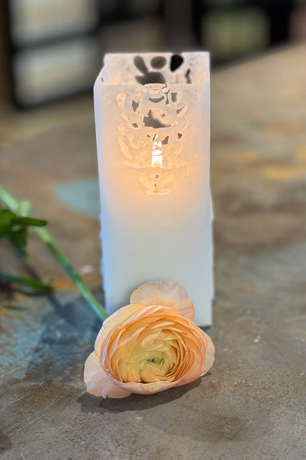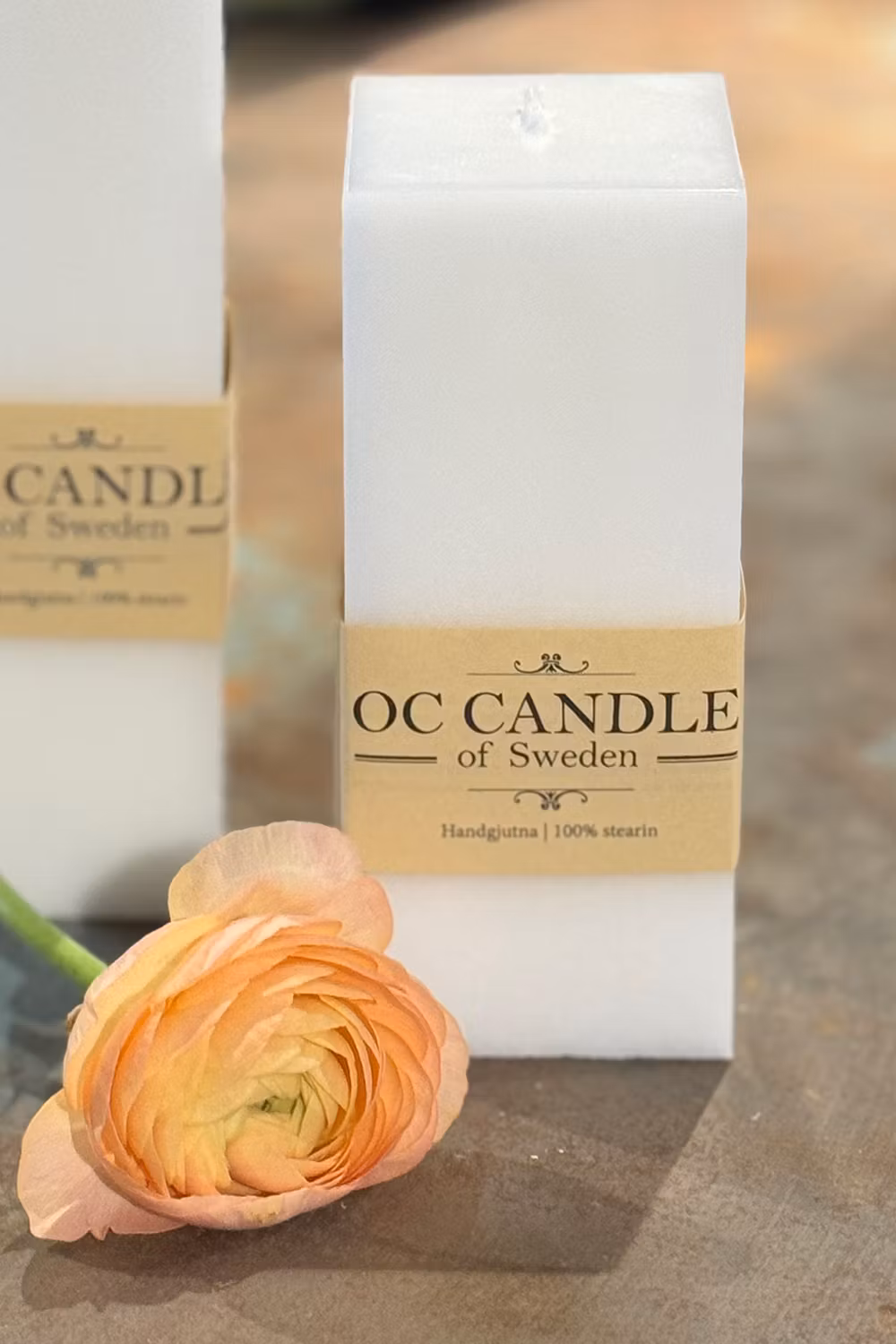 Ett fantastiskt blockljus med kvadratisk form. När det brinner smälter hörnen ner sist vilket gör att det oftast bildas ett vackert nätmönster. Gjuts för hand i 100% stearin, med bomullsveke.