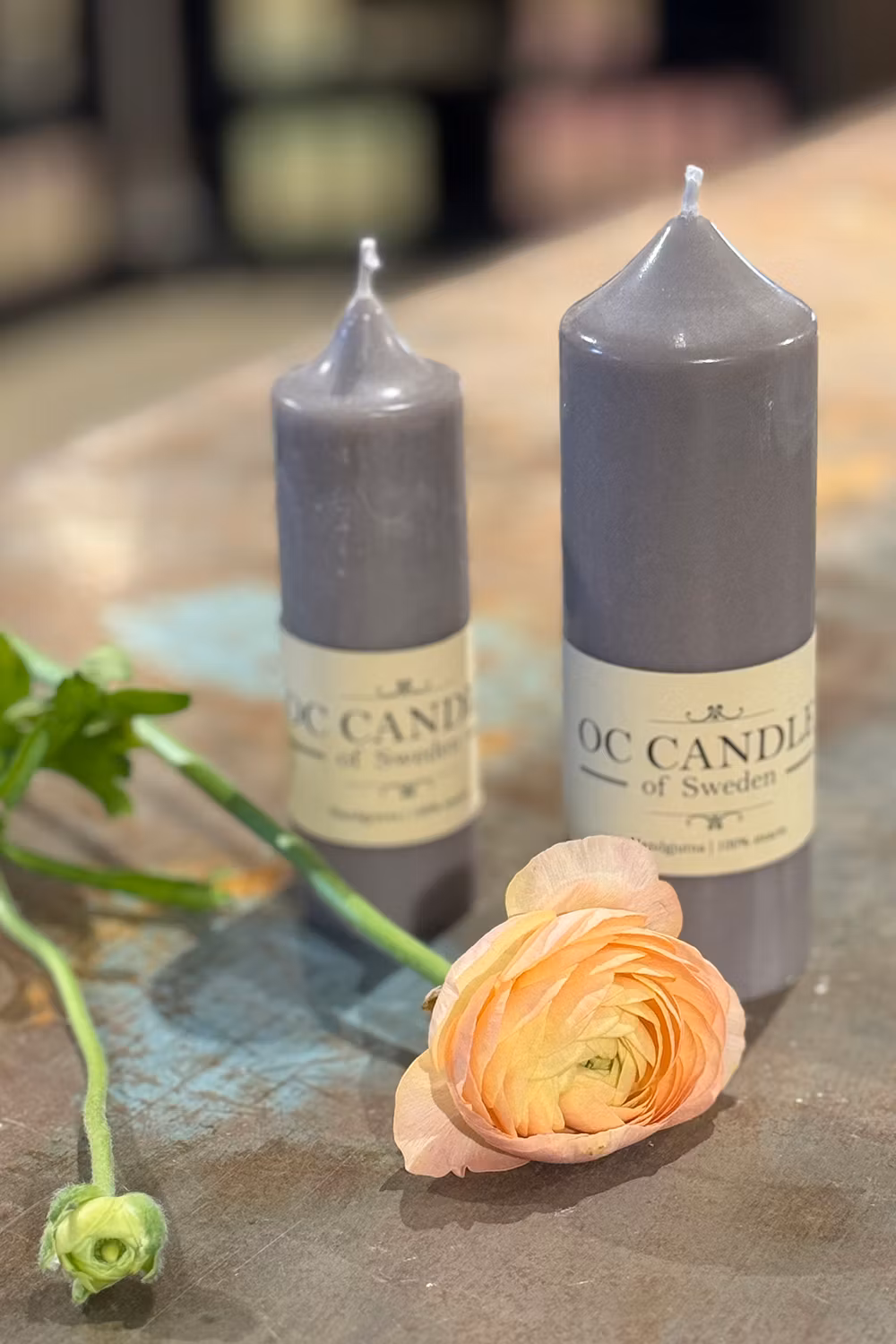 Storlek: 140x50mm.Brinntid: ca 5mm/h.Färg: Mullvad (varm grå), rustik finish.Märke: OC Candle of Sweden